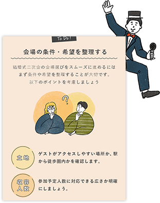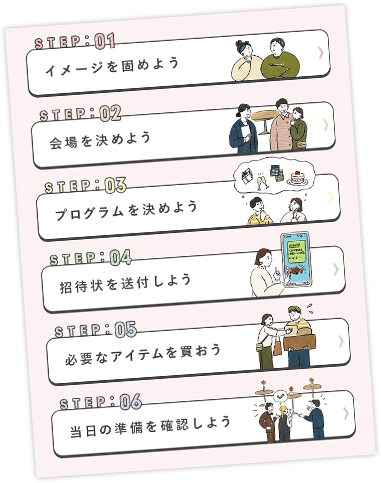 二次会の準備は、実はやることがたくさん!段取りよく進めることが重要です◎結婚式二次会完全ガイドでは、 準備や当日の運営に必要なToDoをステップごとに分けて細かくご紹介しています!